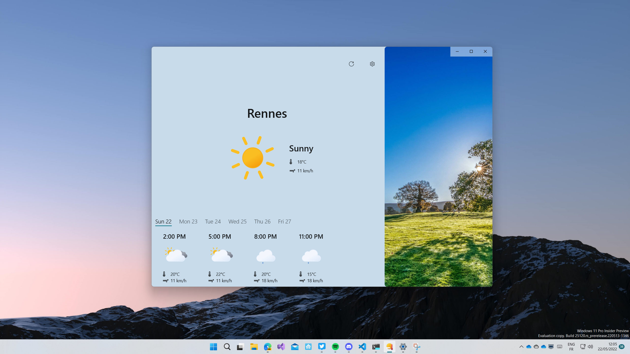 Pour agrémenter l’interface, la rendre plus agréable et donner un aspect positif, peu importe la météo actuelle, une image d’ambiance se place sur la droite. Celle-ci s’adapte à la situation météorologique. Le choix de ces images a été très important, afin d’éviter autant que possible des images avec une ambiance négative, même lorsque la météo est mauvaise.